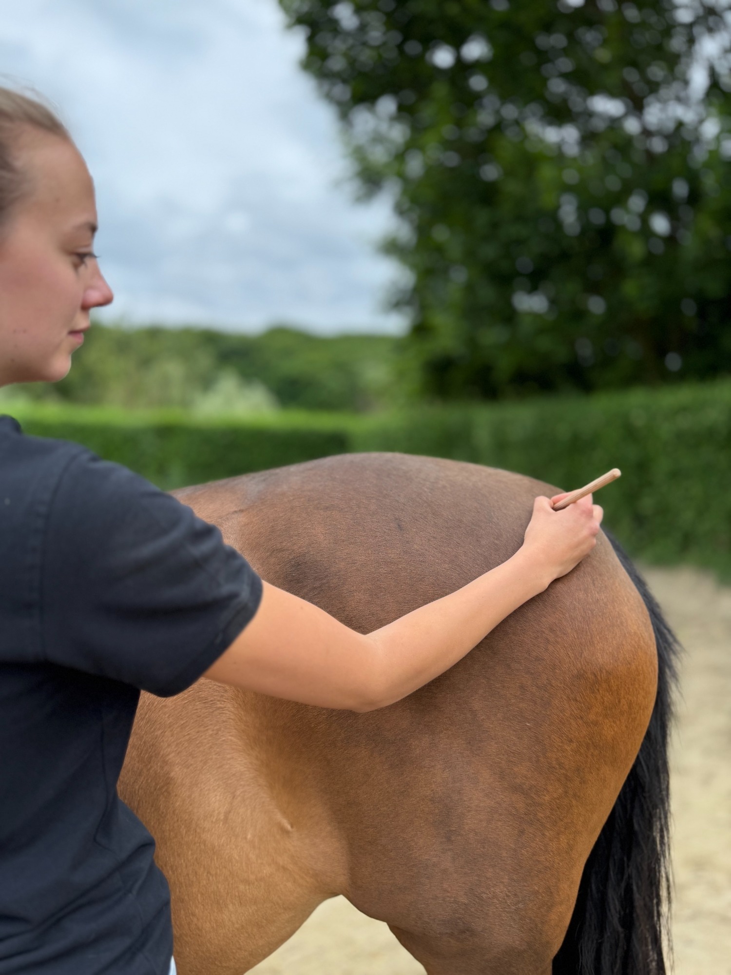 Nach der Anamense folgt meine Befunderhebung inklusive kurzer Ganganalyse. Besteht eine eventuelle Problematik beim Reiten oder in der Bewegung, sollte die Möglichkeit bestehen, dass ich mir Dein Pferd an der Hand, an der Longe oder unter dem Reiter anschauen kann. Ansonsten teste ich die verschiedenen Gelenke, palpiere die Muskulatur und betrachte das Exterieur.